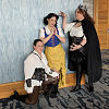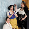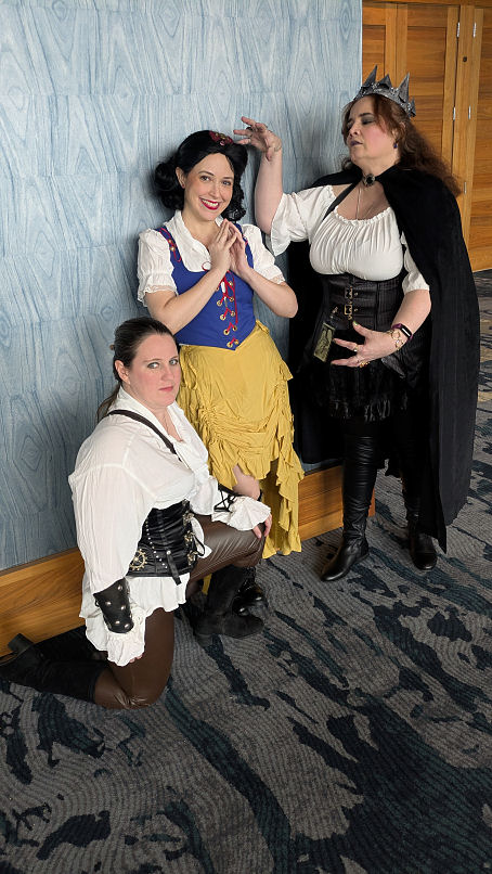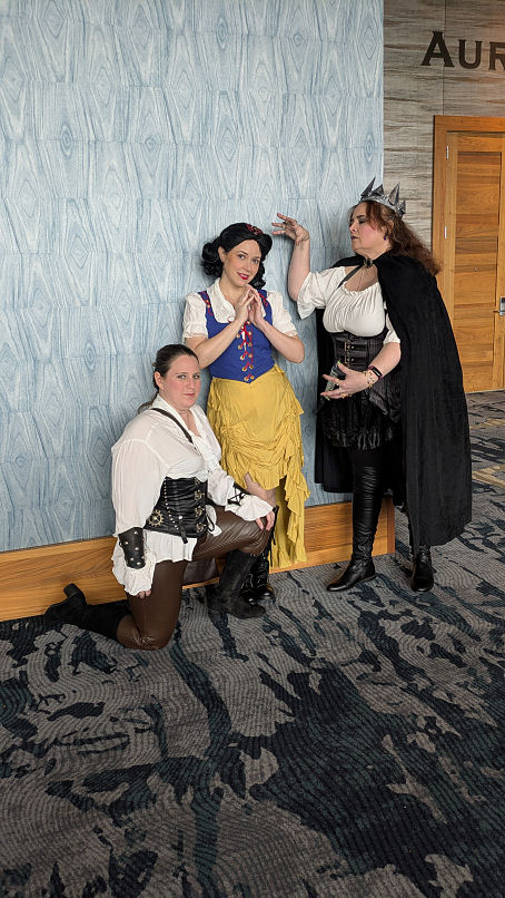 Lady Terentia found me an *adorable* dark red bow with cogs which was *perfect* for Snow White on Etsy made by the seller SugarFlower. I bought the blue bodice from a vendor at the Pennsylvania Ren Faire; I feel bad but I can't remember which one. The shirt is by Scarlet Darkness and the skirt is by ThePirateDressing, and they both, plus a pair of also adorable apple earrings, are from Amazon. The wig is my old Snow White wig that I *finally* cut the attached red bow off of, and the boots are the ones I got for my Maki - Bokura wa Ima no Naka de costume. And when Steph and Patti and I were discussing easy costumes to wear to NDK, they realized they could fashion a Hunter(ess) and Evil Queen to match me. I don't think many people recognized us, but I for one was surprisingly comfortable, and I think we looked pretty darn good.